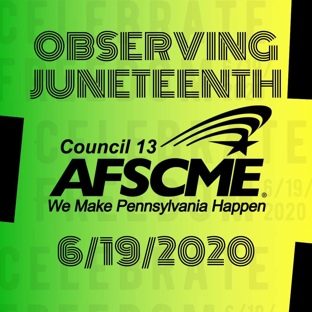 AFSCME Council 13 is proud to represent thousands of public service workers of color, and our union family is excited to celebrate Juneteenth at a time when people in America and around the world have joined together to demand an end to systematic racism and oppression of Black people.