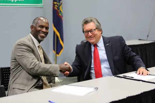 PA Secretary of Administration Michael Newsome shakes hands with Council 13 Executive Director David Fillman following the contract signing.