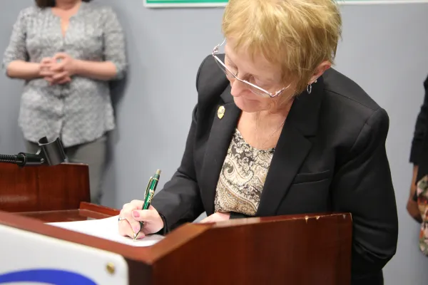 President of AFSCME Local 1357 (NHS) Dona Baxter signs the three-year agreement between AFSCME and NHS.