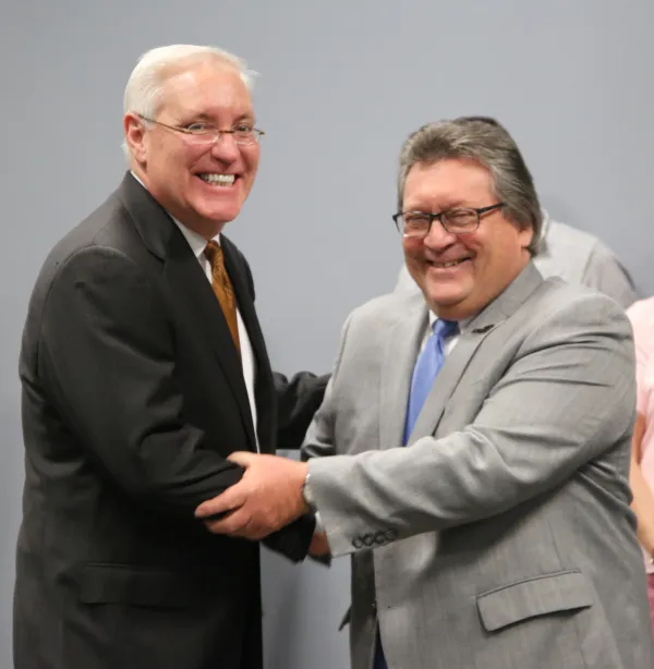 NHS Chief Executive Officer Joseph Martz (left) and Council 13 Executive Director David Fillman (right) shake hands at the Feb. 27 contract signing.