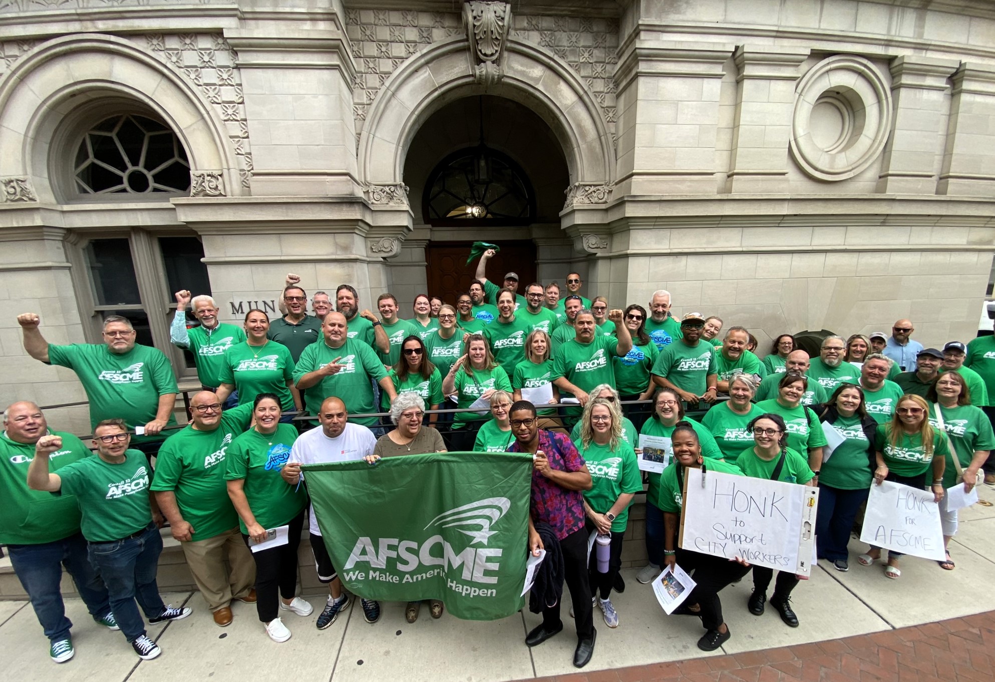 AFSCME brought a wave of green to support Local 1896 members by leafleting outside of City Hall as officials attempt to impose unilateral changes to employees' pay system.