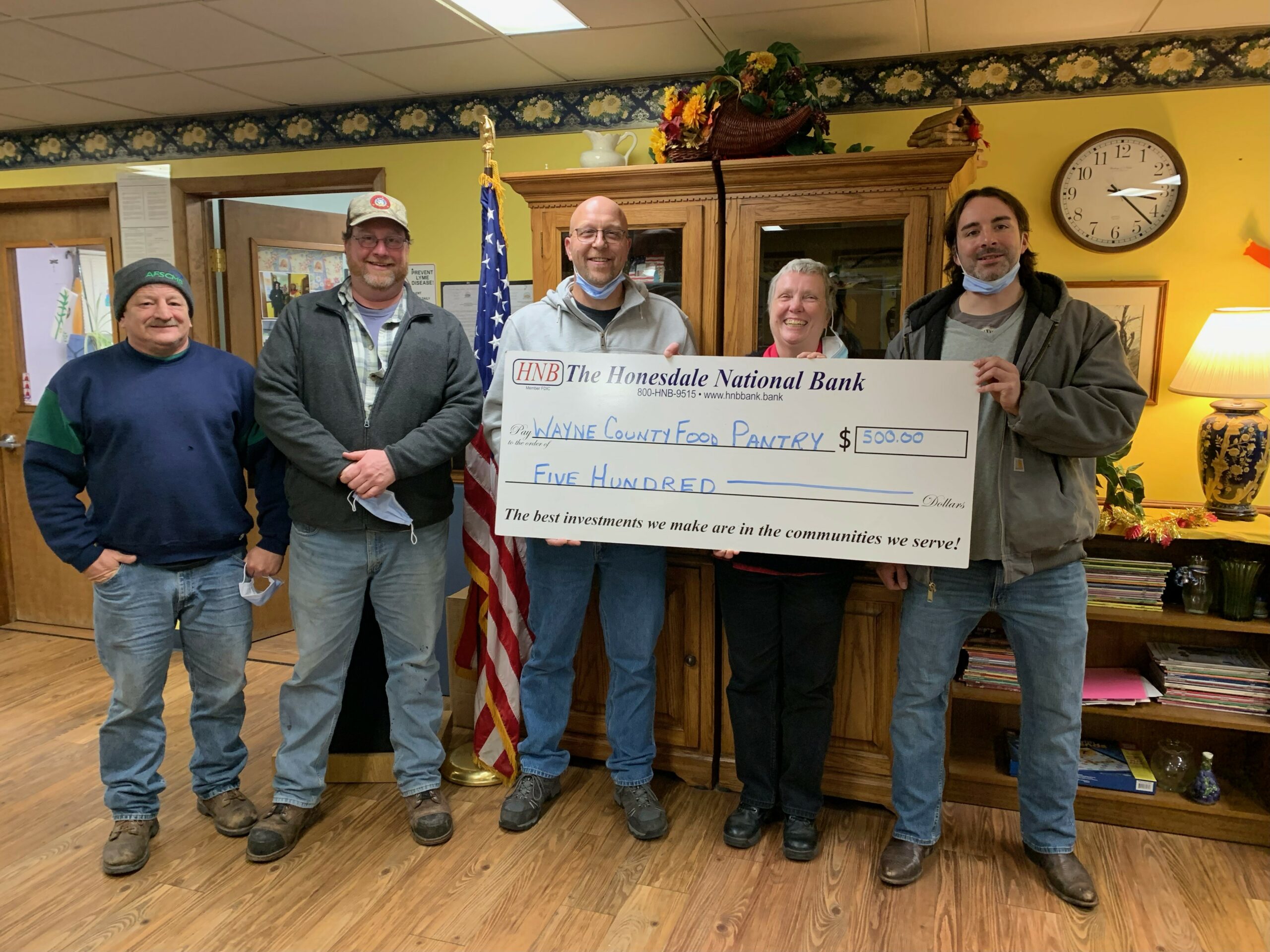 AFSCME Locals 1710 (Wayne County Prison) and 2145 (Wayne County PennDOT) joined together to donate $500 to the Wayne County Food Pantry. Pictured left to right: Sam Mikulak, President of 2145; Michael Schott, Treasurer of 2145; Scott Jaycox, President of 1710; food pantry representative; and Ben Grover, VP of 1710.