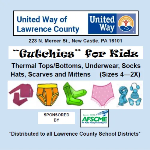 AFSCME Local 2902, representing workers in Lawrence County, sponsored this year’s “Gutchies For Kids” drive in partnership with United Way. According to United Way, the “Gutchies for Kids” program began with the Quota International Club of Hermitage and was introduced to New Castle by then-President Connie McMichaels, Connerly’s Cleaners and the United Way of Lawrence County. “Gutchies” is Western Pennsylvania slang for underwear. Connie started collecting items such as underwear, socks, pajamas, and long underwear for children in our area, and distributing them through Midwestern IU-4 throughout Lawrence County.