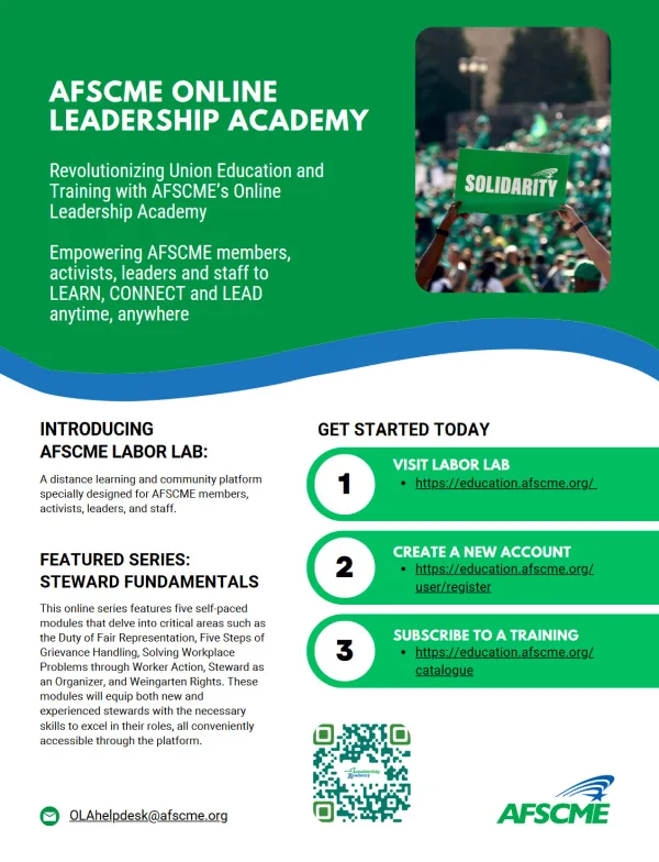 AFSCME has launched a new e-learning platform called the AFSCME Online Leadership Academy, which will provide high-quality training and leadership development for AFSCME leaders, stewards, and staff, allowing them to enhance their union activism anywhere, at any time.