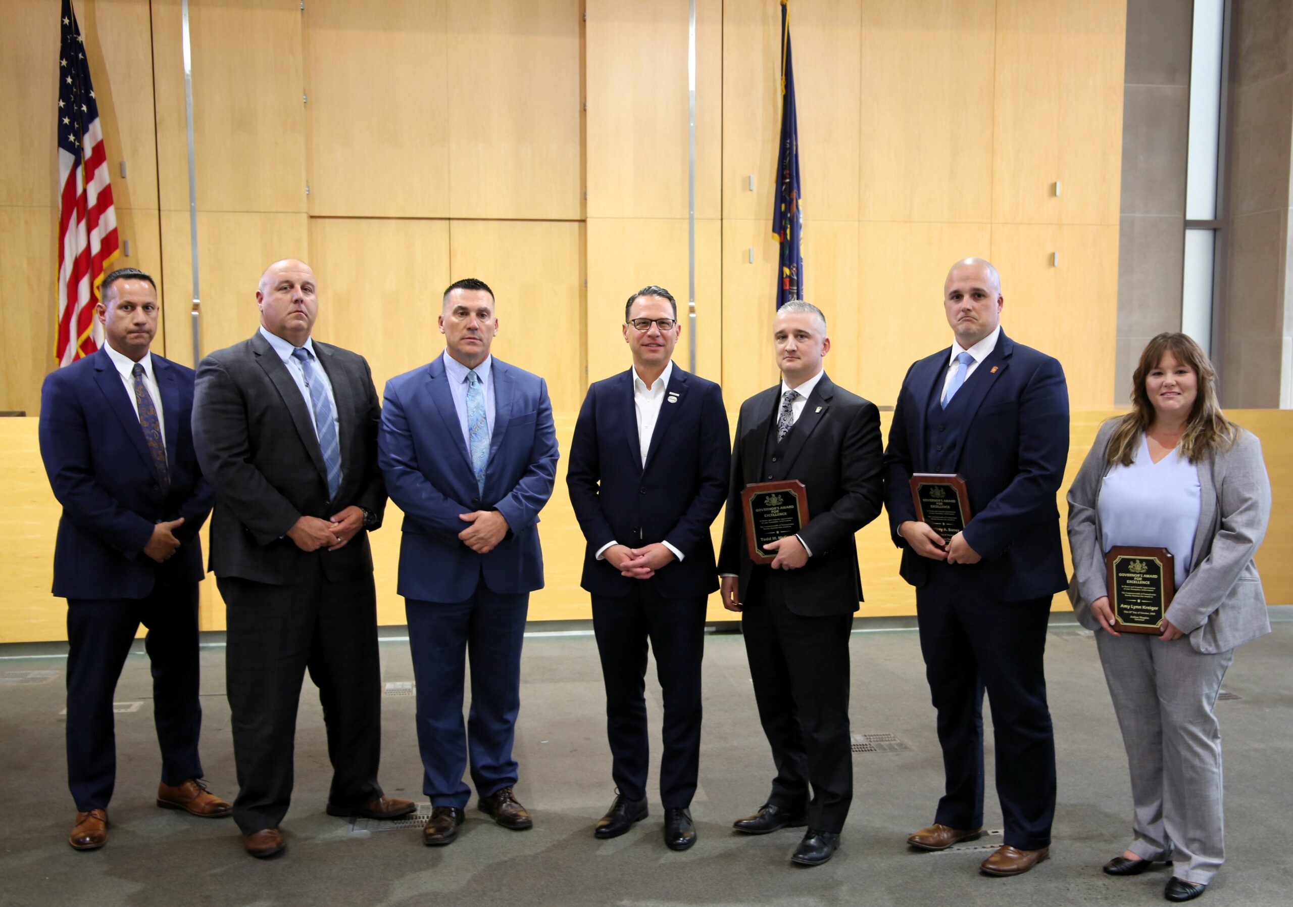 The Pennsylvania State Police's Criminal Investigation Assessment (CIA) Unit join Governor Josh Shapiro for recognition of their outstanding public service, including AFSCME Local 2456 member Amy Kreiger (right).