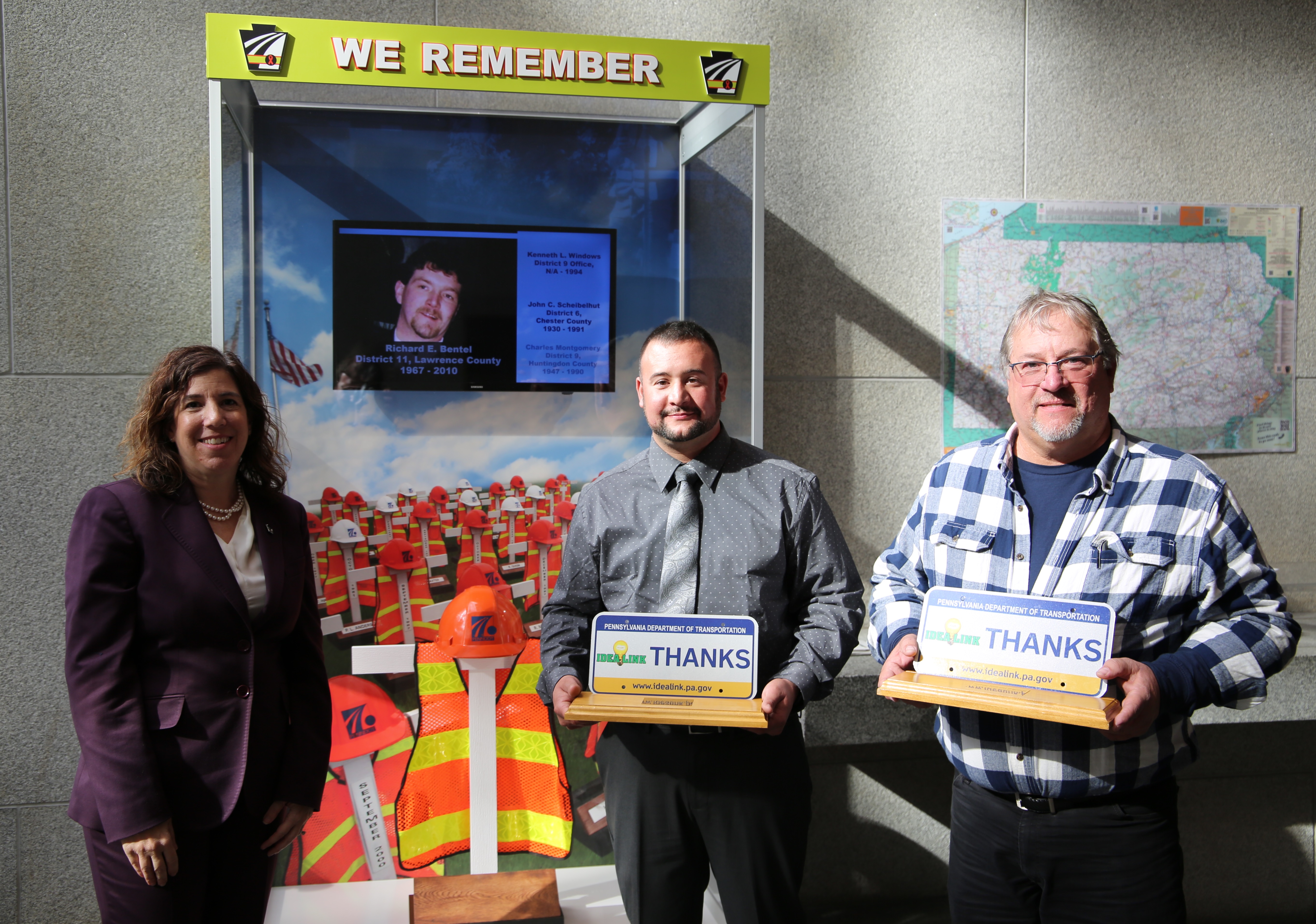 Chris Kapitan and Arlan Thomas (Local 2125, Somerset County Trades & Labor) are presented with an IdeaLink 20/20 Award by Secretary of Transportation Leslie Richards for designing the original PennDOT Workers' Memorial logo.