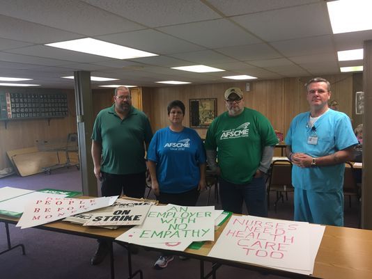 Director of AFSCME District Council 89 Steve Mullen and employees of Cedar Haven Healthcare Center prepare posters for this Friday's strike.
