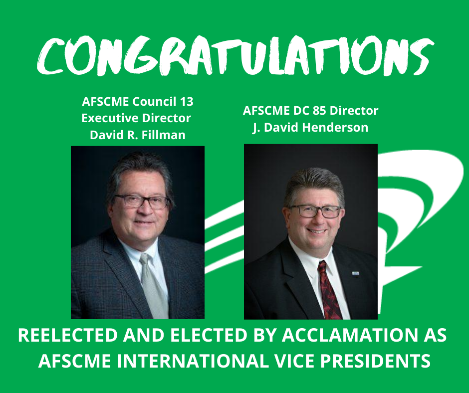 By acclamation, AFSCME Council 13 Executive Director David Fillman was reelected and AFSCME District Council 85 Director David Henderson was elected as International Vice President of AFSCME.