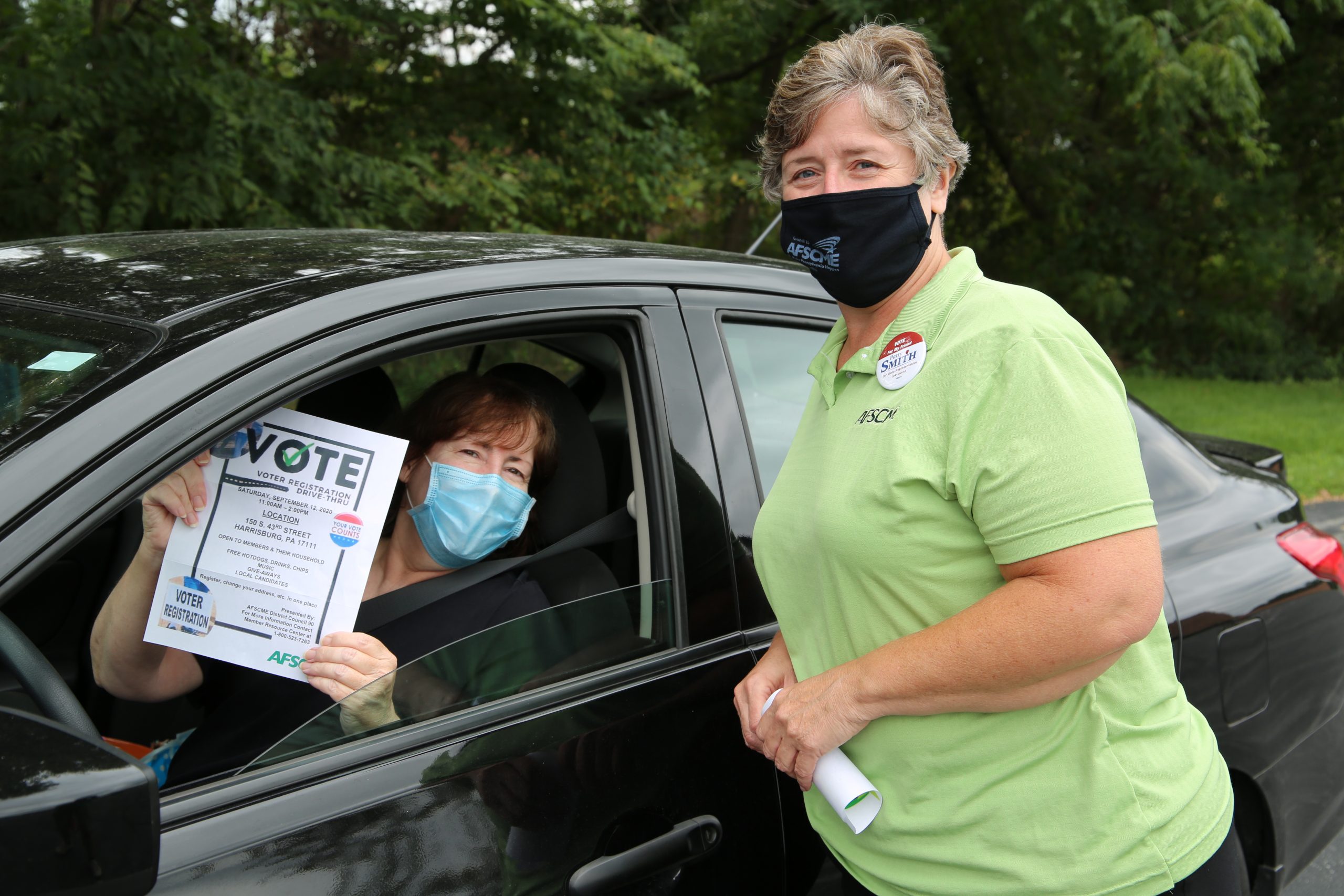 AFSCME members, leaders, staff, and volunteers joined forces with the leaders of the Pennsylvania AFL-CIO and bipartisan candidates for State House and Senate to host a Voter Registration Drive-Thru in Harrisburg on September 12, 2020.