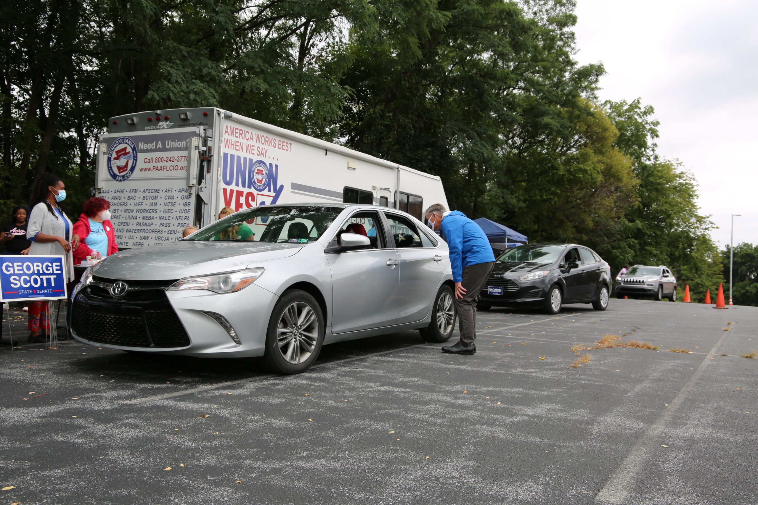 George Scott (Candidate for Pennsylvania's 15th State Senate District) meets AFSCME member going through District Council 90's Voter Registration Drive-Thru.