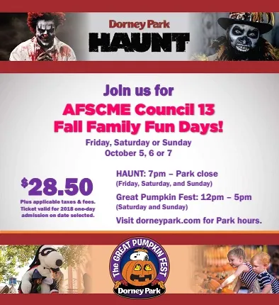Dorney Park & Wildwater Kingdom's Fall Family Fun Days are THIS WEEKEND, October 5-7! AFSCME Council 13 members can get tickets for just $28.50 each by calling 1-800-523-7263!