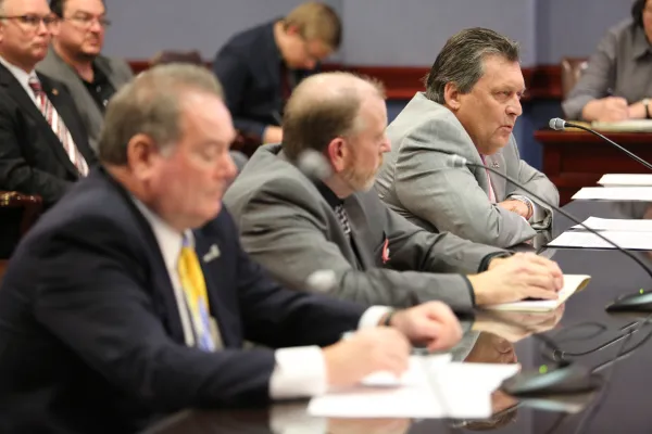 Council 13 Executive Director David Fillman (right) testifies to the PA House Labor and Industry Committee in favor of House Bill 1082, alongside ATU Local 568 President John Renwick (center) and Council 13 Legislative Director Bill Dando (left).