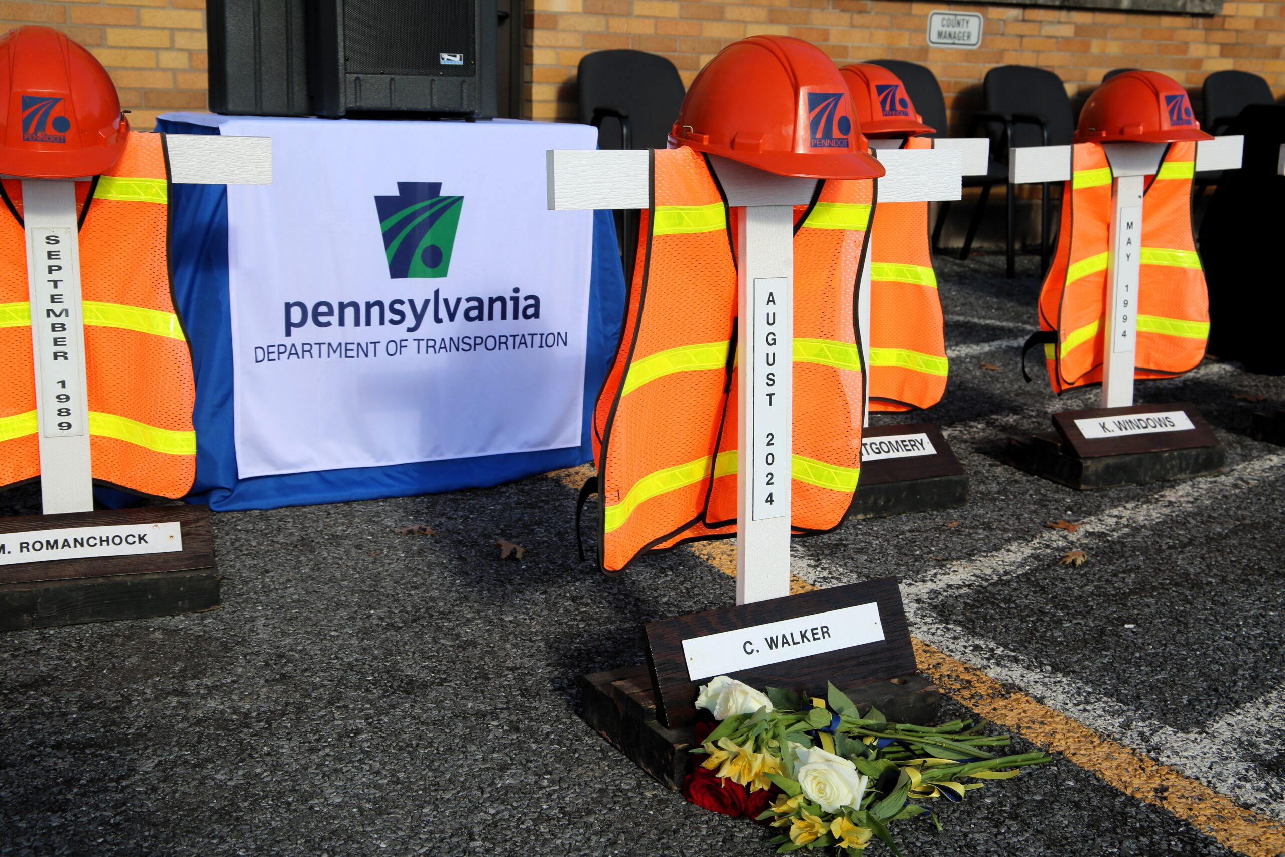 Flowers are laid at the cross and hard hat representing Rodney "Craig" Walker's addition to the PennDOT Traveling Worker's Memorial.