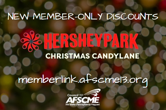 Members of AFSCME Council 13 are eligible for discounts on tickets to Hersheypark Christmas Candylane, as well as Hershey Sweet Lights (a drive-through light display separate from Hersheypark).