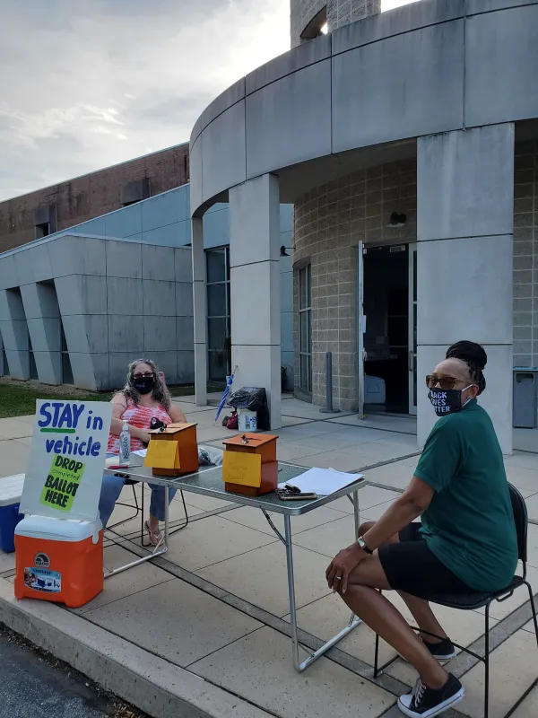 AFSCME Local 2456 Trustee Danielle Gibson (left) and Local 2456 Steward Michele Brookins (right) collect ballots for their drive-thru election.