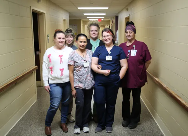 The nurses of Mountain View want a fair contract so they can focus on caring for their residents! Pictured left to right: Local 2016 VP Laura Snyder, Michelle Derr, Rochelle Hinds Gonzalez, Local 2016 President Amy Thomas, Hannah Long, and Tracey Shaw.