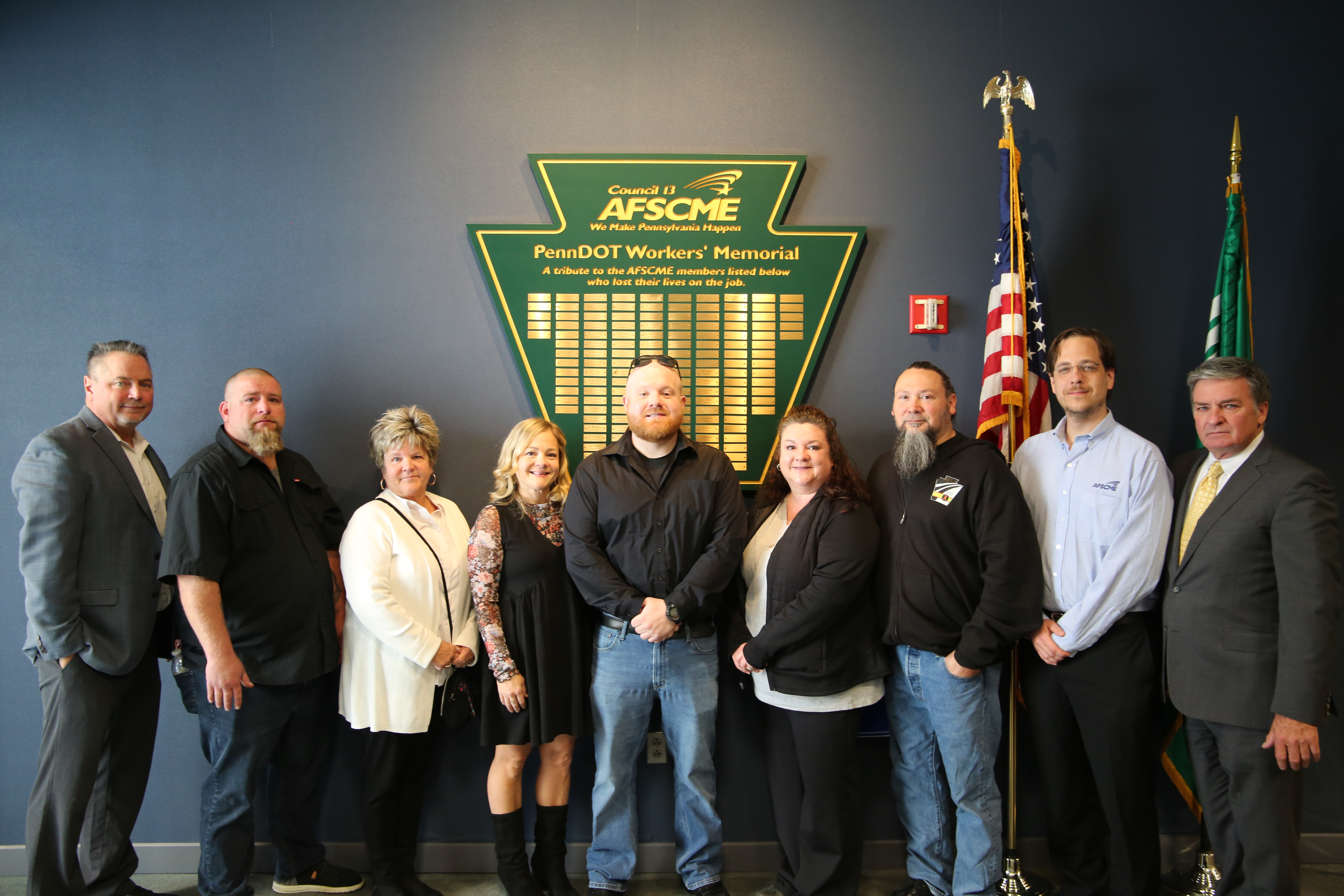 Pictured left to right: Council 13 Administrator Jim Howell, AFSCME Local 2128 VP Joshua Schooley, Rose Walker (wife of Craig), Wendy Beckwith (daughter of Craig), Ryan Walker (son of Craig), Michelle Gallatin-Baughman & Jamie Baughman (stepmother & father of Seth), Council 13 Deputy Administrator Maximus Weikel, and PennDOT Secretary Mike Carroll.