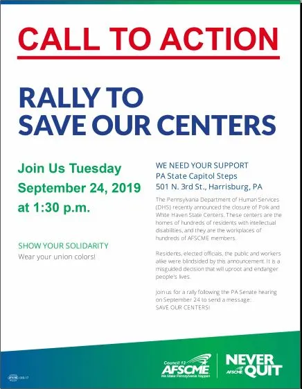 Join us on Tuesday, September 24, 2019, at 1:30 p.m., on the Pennsylvania State Capitol steps in Harrisburg, as we rally to save Polk and White Haven State Centers.