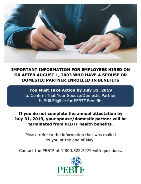 Commonwealth employees covered by the Pennsylvania Employee Benefit Trust Fund (PEBTF) must complete their Spousal Attestation by July 31, 2019, to confirm that their spouse or domestic partner is still eligible for PEBTF benefits.