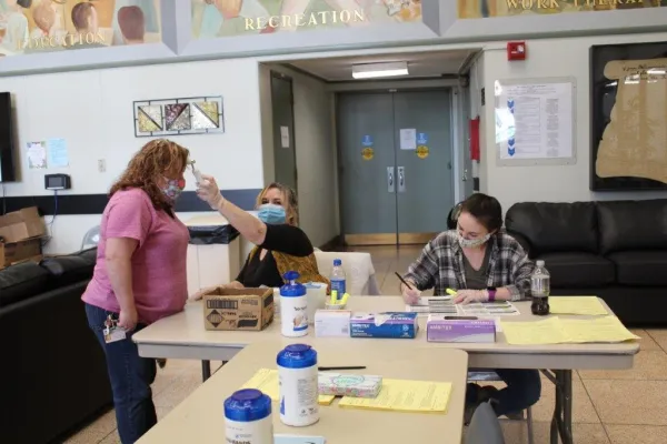 AFSCME Local 166 (Selinsgrove Center) members Michelle Rosancrans, Brenda Landis, and Allison Fegley, perform temperature checks.