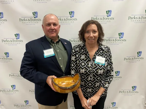 DCNR District Forester Nick Lylo and AFSCME Local 2453 member/DCNR Administrative Assistant Amy Orzel receive the Forest of the Year Award on behalf of Pinchot State Forest at the PPFF Awards Banquet on May 16, 2023.